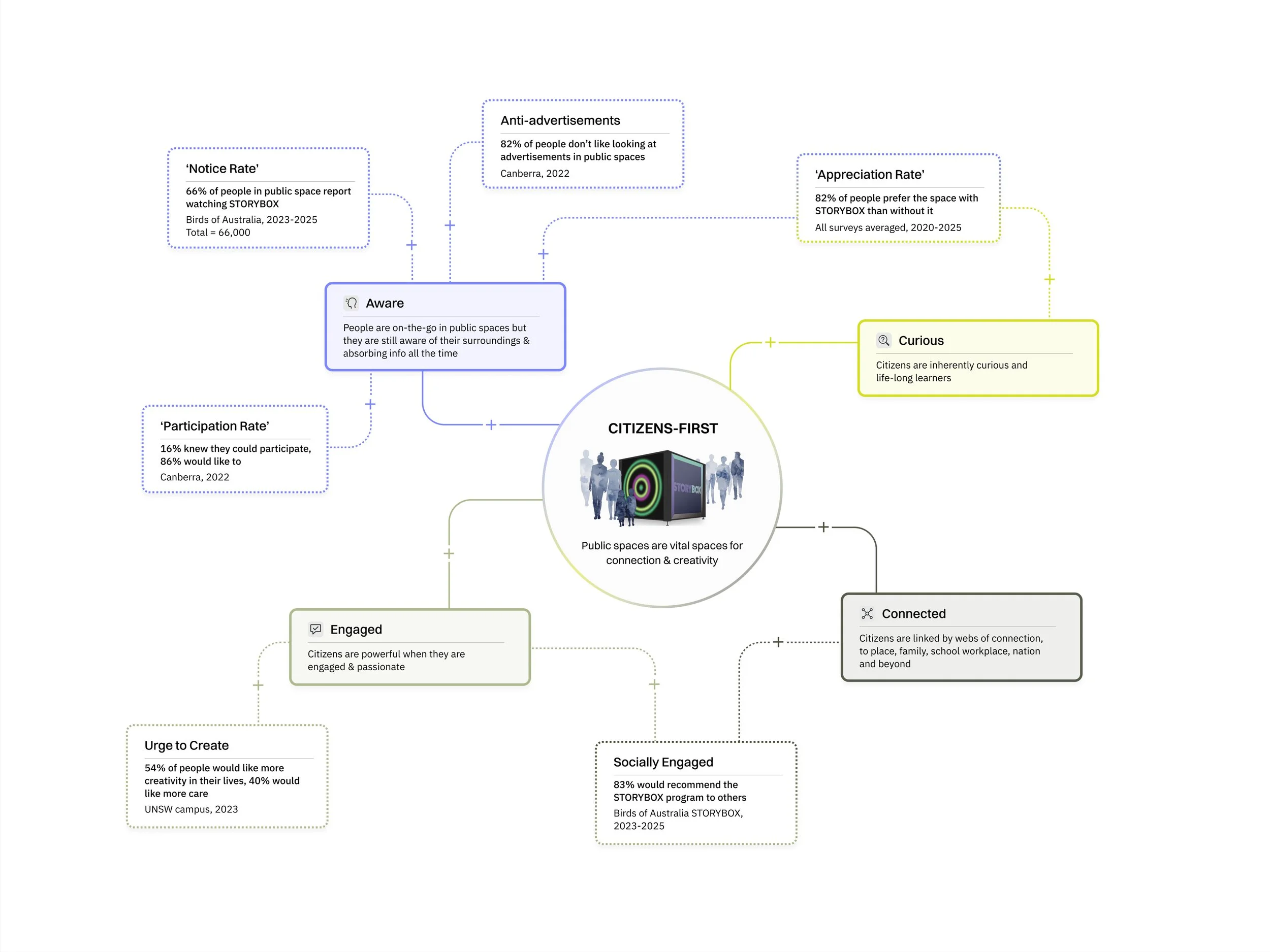 The STORYBOX platform is underpinned by an ethos of ‘citizen-first’ public engagement. Our audiences are treated as citizens, not consumers. Our partners are cultural institutions, educators and precinct managers, who work with us to expand their reach in public spaces and build new connections with citizens.